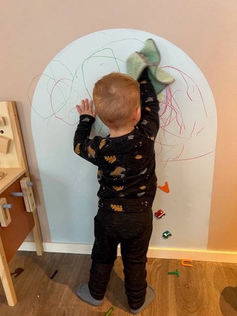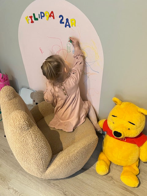 Tavlen festes enkelt på veggen og kan brukes igjen og igjen. Perfekt for kreativ lek, bokstaver, tall og beskjeder i hverdagen.